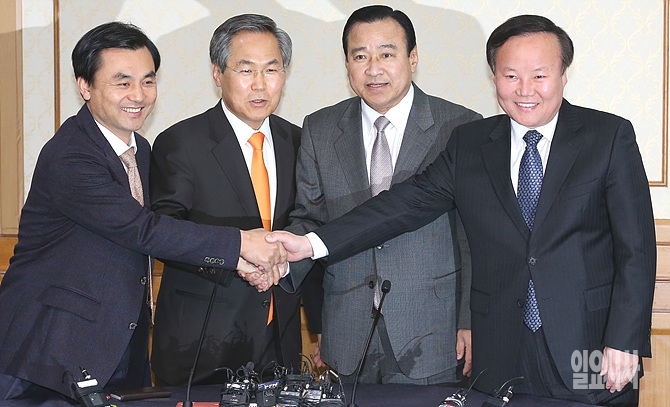 새누리당 이완구(사진 오른쪽서 두 번째)·새정치민주연합 우윤근 원내대표와 김재원·안규백 여야 원내수석부대표(사진 왼쪽)가 18일 오전, 서울 여의도 국회 귀빈식당에서 열린 여야 원내대표단 주례회동서 악수를 나누고 있다.