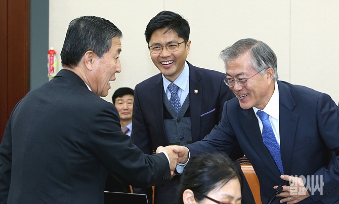 1일, 서울 여의도 국회 의원회관에서 새정치민주연합 민주정책연구원 등 주최로 '종편 3주년, 현황 및 평가 토론회'가 열린 가운데, 황진하 새누리당 의원과 문재인 새정치민주연합 의원이 악수를 나누고 있다