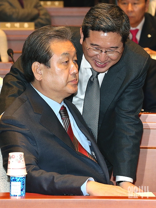 서울 여의도 국회 예결위 회의장에서 8일, 새누리당 김무성 대표가 의원총회 도중 김학용 대표비서실장과 이야기를 나누고 있다.