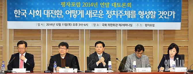 11일, 김부겸 전 새정치민주연합 의원(사진 왼쪽), 심상정 정의당 원내대표(사진 오른쪽) 등이 참석한 가운데, 서울 여의도 국회 의원회관에서 평자포럼 2014년 연말 대토론회 '한국 사회 대전환, 어떻게 새로운 정치주체를 형성할 것인가'가 열리고 있다.