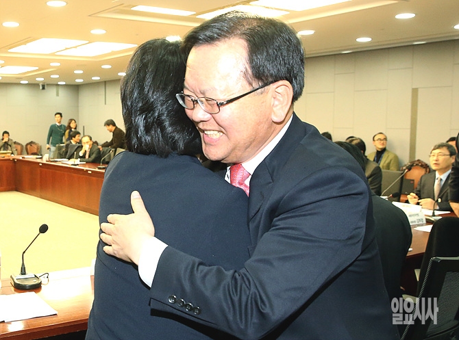 11일, 서울 여의도 국회 의원회관에서 평자포럼 2014년 연말 대토론회 '한국 사회 대전환, 어떻게 새로운 정치주체를 형성할 것인가'가 열린 가운데, 토론회 직전 김부겸 새정치민주연합 전 의원(사진 오른쪽)과 심상정 정의당 원내대표가 반가움의 포옹을 하고 있다.