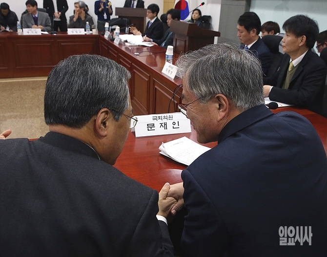 17일, 서울 여의도 국회 의원회관에서 열린 '이기는 혁신-새정치민주연합의 혁신' 토론회에서 문재인 의원(사진 오른쪽)이 우윤근 원내대표와 악수를 나누고 있다.