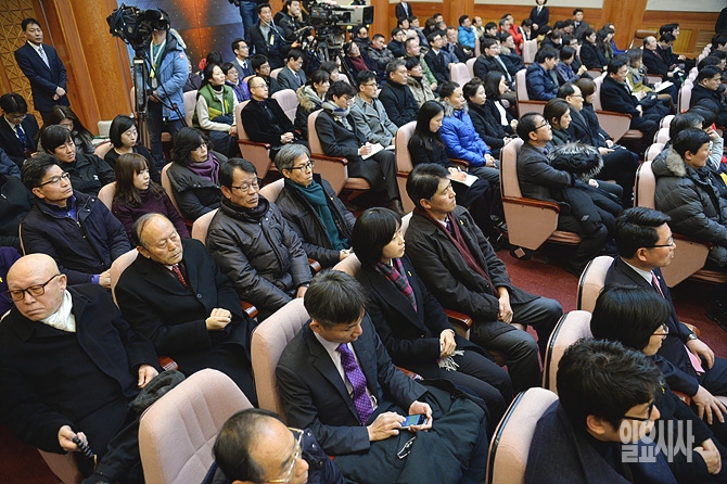 통합진보당 이상규·김재연 의원, 관계자 등이 19일, 서울 종로구 재동 헌법재판소 대심판정에서 열린 통합진보당에 대한 정당해산심판 청구 소송을 지켜보고 있다.