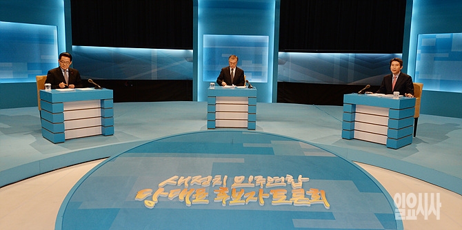 29일, 서울 여의도 KBS본관에서 열린 '새정치민주연합 당대표후보자 토론회'에 (왼쪽부터) 박지원-문재인-이인영 후보가 참석해 열띤 토론을 벌이고 있다.