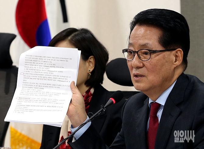 2일, 서울 여의도 국회에서 새정치민주연합 당대표 후보로 나선 박지원 후보가 긴급간담회에서 준비한 자료를 제시하고 있다.