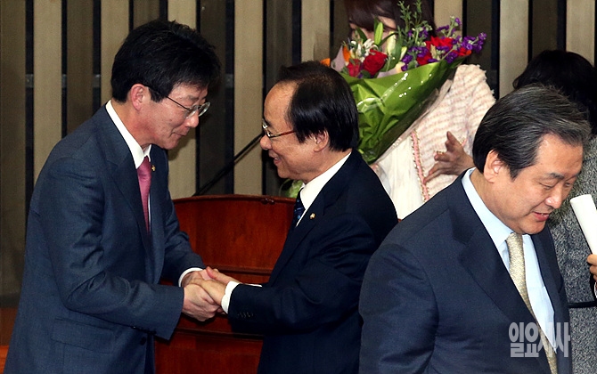 2일, 서울 여의도 국회에서 열린 새누리당 원내대표 경선 의원총회에서 유승민 후보가 신임 원내대표를 확정지은 후 경쟁후보였던 이주영 후보에게 축하의 악수를 건네받고 있다.