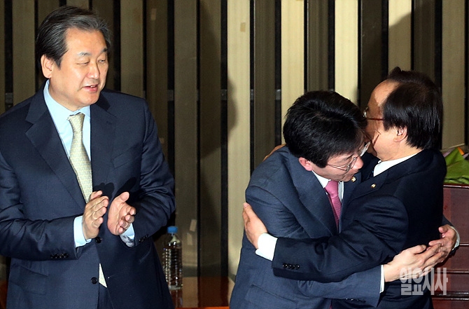 2일, 서울 여의도 국회에서 열린 새누리당 원내대표 경선 의원총회에서 유승민 후보가 신임 원내대표를 확정지은 뒤 경쟁후보였던 이주영 후보와 포옹하고 있다.