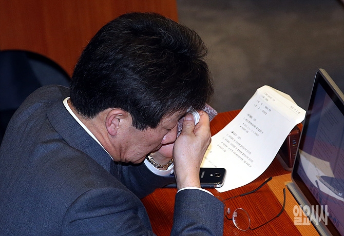 2일, 서울 여의도 국회 본회의장에서 열린 이완구 국무총리 후보자에 대한 인사청문회 관련 국회 본회의에 참석한 새누리당 신임 유승민 원내대표가 피곤한 듯 안경을 벗고 눈물을 닦고 있다.