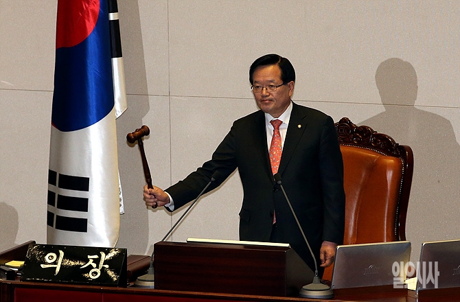 2일, 정의화 국회의장이 서울 여의도 국회 본회의장에서 열린 이완구 국무총리 후보자에 대한 인사청문회 관련 국회 본회의 개의를 알리는 의사봉을 두드리고 있다.