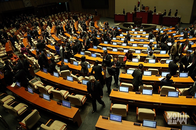 2일, 서울 여의도 국회 본회의장에서 열린 이완구 국무총리 후보자에 대한 인사청문회 관련 국회 본회의가 종료된 가운데, 의원들이 본회의장을 나서고 있다.