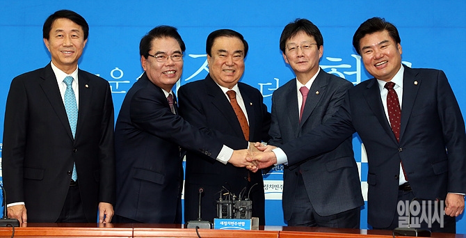 2일, 유승민 새누리당 신임 원내대표(사진 오른쪽서 두 번째)가 서울 여의도 국회 새정치민주연합 문희상 비상대책위원장(사진 가운데), 백재현 정책위의장 등 새정치민주연합 지도부를 예방한 자리에서 악수를 나누고 있다.