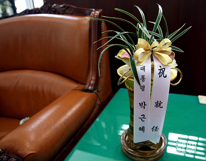3일, 서울 여의도 국회 새누리당 원내대표실에 박근혜 대통령이 보낸 유승민 신임 새누리당 원내대표 취임 축하 화환이 놓여져 있다.