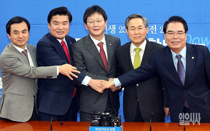 3일, 새누리당 유승민 신임 원내대표(사진 가운데), 원유철 신임 정책위의장(사진 왼쪽서 두 번째)이 서울 여의도 국회에서 열린 여야 주례회동 직전, 새정치민주연합 우윤근 원내대표(사진 오른쪽서 두 번째), 백재현 정책위의장(사진 오른쪽) 등과 함께 손을 맞잡고 있다.