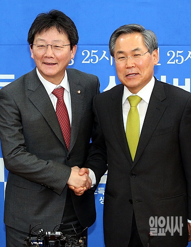 3일, 새누리당 유승민 신임 원내대표가 서울 여의도 국회에서 열린 여야 주례회동 직전, 새정치민주연합 우윤근 원내대표와 악수를 나누고 있다.