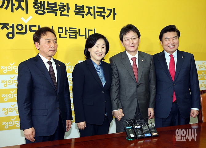3일, 서울 여의도 국회에서 유승민 새누리당 신임 원내대표(사진 오른쪽서 두 번째)-원유철 신임 정책위의장(사진 오른쪽)이 정의당 심상정 원내대표(사진 왼쪽서 두 번째)와의 예방 자리에서 기념촬영을 하고 있다.