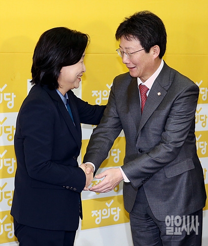 3일, 서울 여의도 국회에서 유승민 새누리당 신임 원내대표가 정의당 심상정 원내대표와의 예방 자리에서 반가운 표정으로 악수를 나누고 있다.