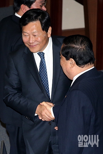 4일 오전, 서울 여의도 국회 본회의장에서 문희상 새정치민주연합 비상대책위원장과 강동원 의원이 악수를 나누고 있다.