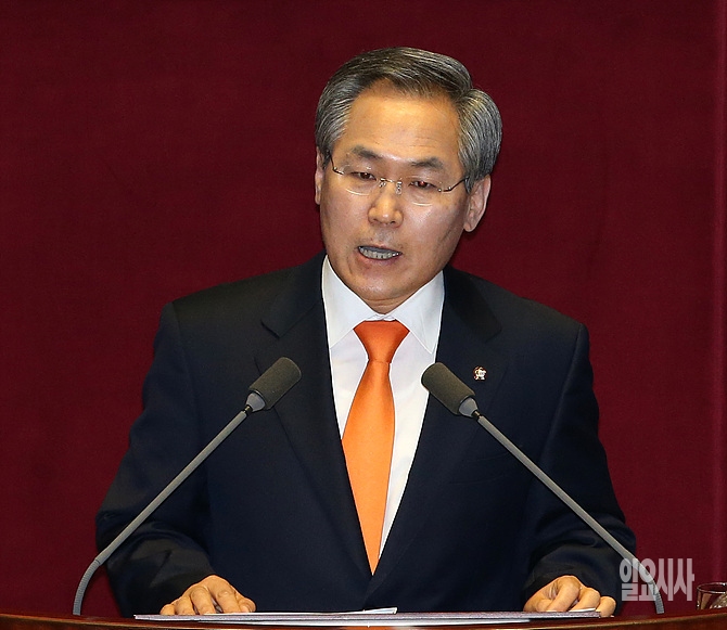 4일 오전, 서울 여의도 국회 본회의장에서 우윤근 원내대표가 교섭단체 대표연설을 하고 있다.