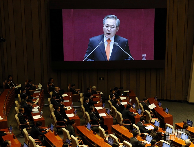 4일, 서울 여의도 국회 본회의장에서 새정치민주연합 우윤근 원내대표가 원내교섭단체 대표연설을 하고 있다.