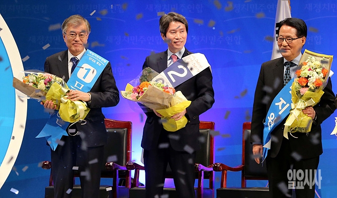 8일, 서울 잠실 올림픽체조경기장에서 열린 새정치민주연합 전당대회 직후 문재인 후보(사진 왼쪽)가 당선을 확정 짓자, 이인영(사진 가운데)·박지원 후보가 웃고 있는 가운데 묘한 웃음을 짓고 있다.