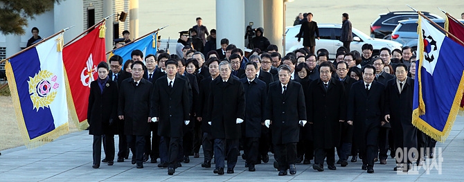 9일, 문재인 새정치민주연합 신임대표 문희상 비대위원장, 우윤근 원내대표, 정세균 상임고문 등 관계자들이 서울 동작구 국립묘지 참배를 위해 국립현충원 안으로 입장하고 있다.