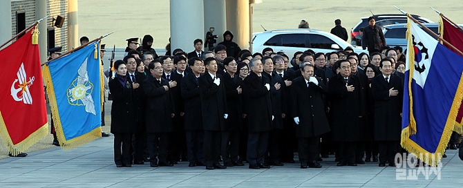 9일, 문재인 새정치민주연합 신임대표 문희상 비대위원장, 우윤근 원내대표, 정세균 상임고문 등 관계자들이 서울 동작구 국립묘지 참배를 위해 국립현충원 안으로 입장 도중 국기에 대한 경례를 하고 있다.