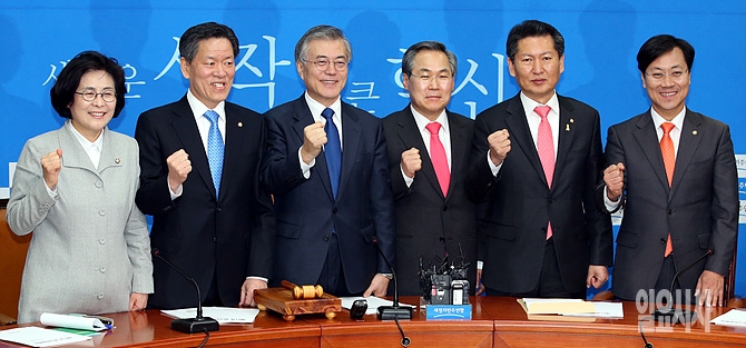 9일, 서울 여의도 국회 새정치민주연합 회의실에서 열린 최고위원회의 직전, 문재인 대표(사진 왼쪽서 세 번째) 등 2·8전당대회를 통해 선출된 지도부가 파이팅을 외치고 있다.