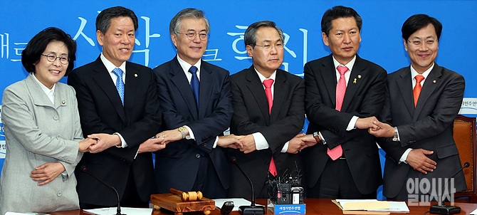 9일 서울 여의도 국회 새정치민주연합 회의실에서 열린 최고위원회의 직전, 문재인 대표(사진 왼쪽서 세 번째), 정청래 최고위원등 새 지도부가 손을 맞잡고 있다.