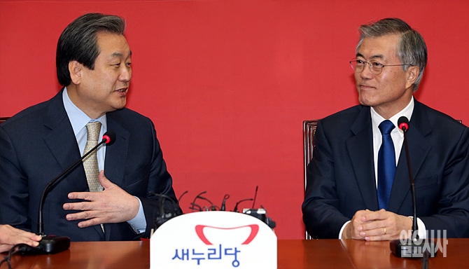9일, 새정치민주연합 문재인 신임대표가 서울 여의도 국회 새누리당 당대표실의 김무성 대표를 예방해 환담을 나누고 있다.