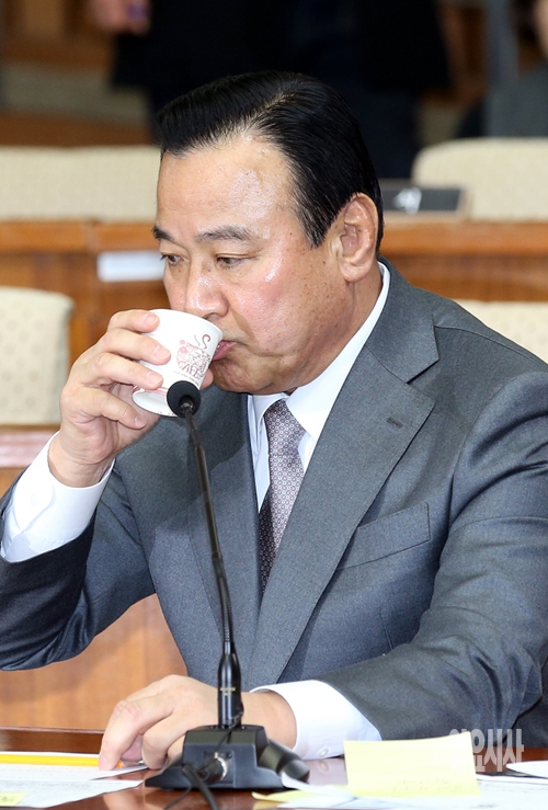 이완구 국무총리 후보자가 10일 오전 서울 여의도 국회에서 열린 인사청문회에서 의원들의 질의를 받는 도중 물을 마시고 있다.