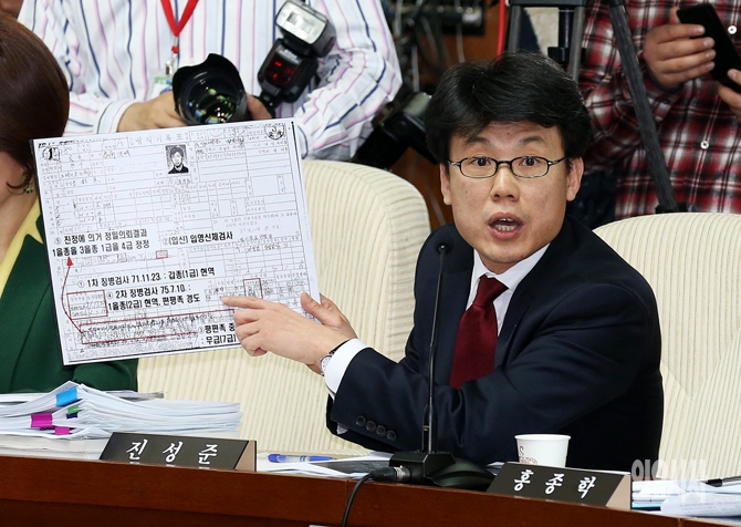 진성준 새정치민주연합 의원이 10일 오전 서울 여의도 국회에서 열린 이완구 국무총리 후보자 인사청문회에서 이 후보자의 병적기록표를 들고 질의하고 있다.