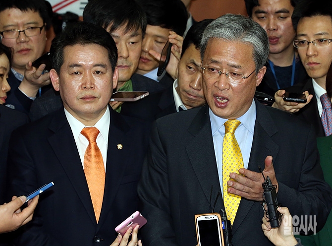 10일, 서울 여의도 국회 정론관 앞에서 새정치민주연합 유성엽 의원(이완구 총리후보자 인사청문특위 야당 간사, 사진 오른쪽)가 '녹취록 관련' 긴급 브리핑 직후 취재진의 질문에 답변하고 있다.