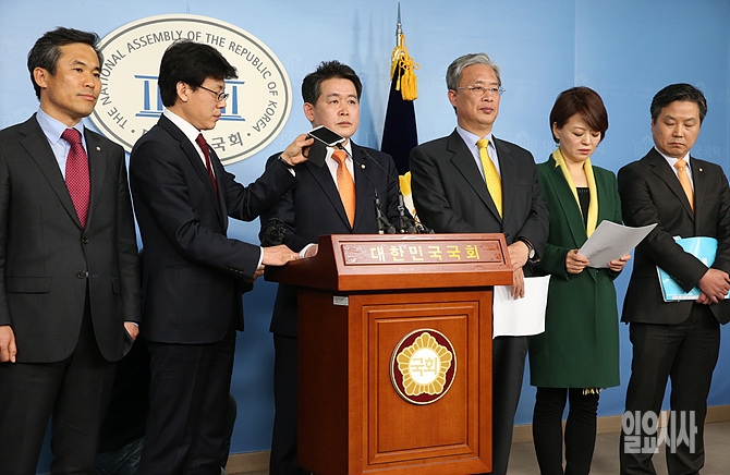 10일, 서울 여의도 국회 정론관에서 이완구 총리후보자 인사청문특위 진성준 의원이 '녹취록 관련' 긴급 브리핑 도중 녹취록을 공개하고 있다.