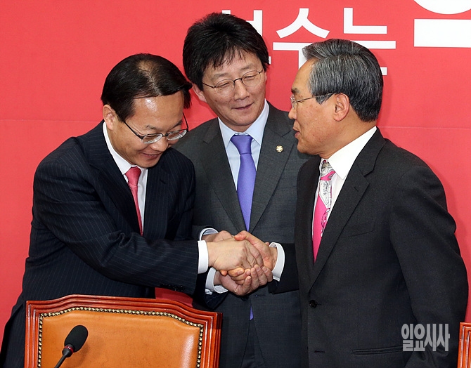 10일, 서울 여의도 국회에서 새누리당 조해진 원내수석부대표와 새정치민주연합 우윤근 원내대표가 주례회동 직전, 악수를 나누고 있다.