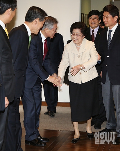 11일, 문재인 새정치민주연합 대표와 최고위원들이 서울 마포구 동교동 김대중도서관을 방문한 자리에서 이희호 여사가 문 대표와 악수를 나누고 있다. (사진공동취재단)