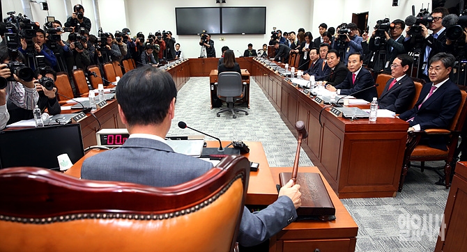 12일, 야당 의원들이 불참한 가운데 한선교 인사청문특위위원장이 서울 여의도 국회에서 열린 이완구 국무총리 후보자에 대한 인사청문 보고서 채택을 선언하며 의사봉을 두드리고 있다.