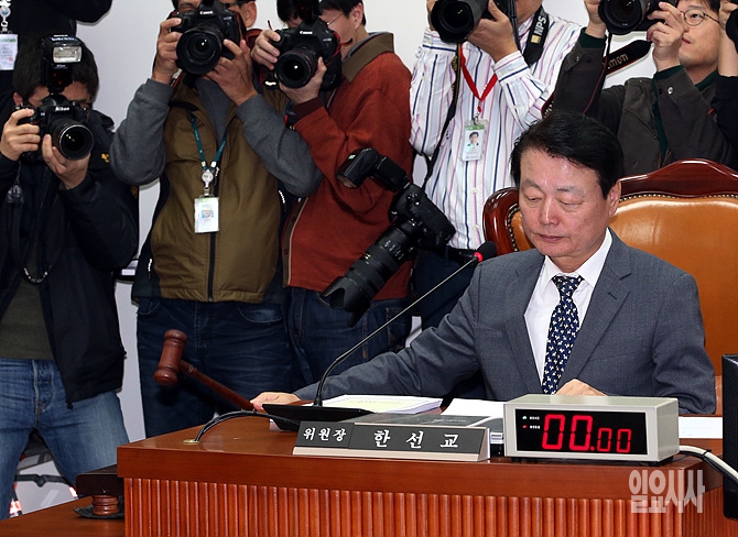 12일, 한선교 인사청문특위위원장이 야당 의원들이 불참한 가운데 서울 여의도 국회에서 열린 이완구 국무총리 후보자에 대한 인사청문 보고서 채택을 알리는 의사봉을 두드리고 있다.