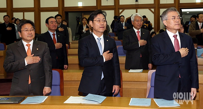 23일, 서울 여의도 국회 의원회관 소회의실에서 열린 '박근혜정부 2년 평가, 불통의 리더십, 무너진 민생경제' 토론회 직전, 문재인 새정치민주연합 대표(사진 오른쪽), 강기정 의원(사진 왼쪽) 등 참석자들이 국기에 대한 경례를 하고 있다.