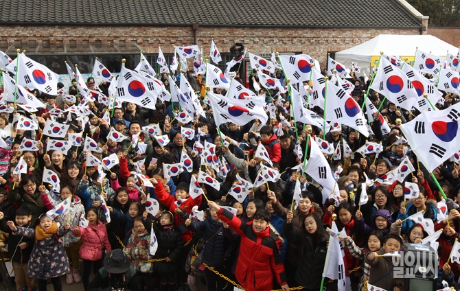 삼일절인 1일 오전 서울 서대문형무소역사관에서 열린 '서대문, 1919 그날의 함성!' 행사에 참여한 시민들이 태극기를 흔들며 '대한독립만세'를 외치고 있다.