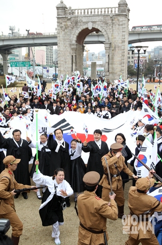 삼일절인 1일 오전 서울 서대문형무소역사관 독립공원에서 열린 '서대문, 1919 그날의 함성!' 행사에 참여한 시민들이 '대한독립만세'를 외치며 3.1운동을 재현하고 있다.