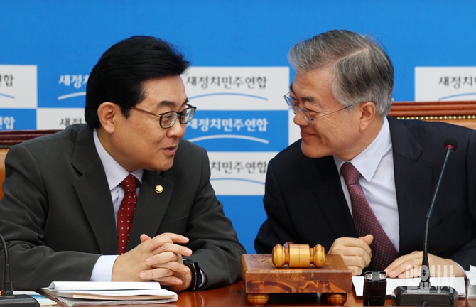 새정치민주연합 문재인 대표(오른쪽)와 전병헌 최고위원이 2일 오전 서울 여의도 국회에서 열린 최고위원회의에서 대화하고 있다.