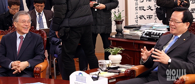 2일 오전, 서울 여의도 국회 의장집실에서 새정치민주연합 문재인 대표가 정의화 국회의장(사진 오른쪽)과의 환담을 나누고 있다.