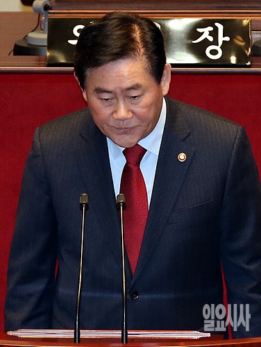 2일, 서울 여의도 국회에서 국회 예산결산위원회 전체회의가 열린 가운데 최경환 경제부총리 겸 기획재정부 장관이 단상에서 의원들을 향해 인사하고 있다.