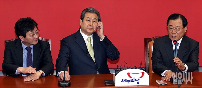 2일, 서울 여의도 국회 새누리당 대표실을 예방한 이병기 신임 대통령실장(사진 오른쪽)이 김무성 대표(사진 가운데), 유승민 원내대표와 환담을 나누고 있다.