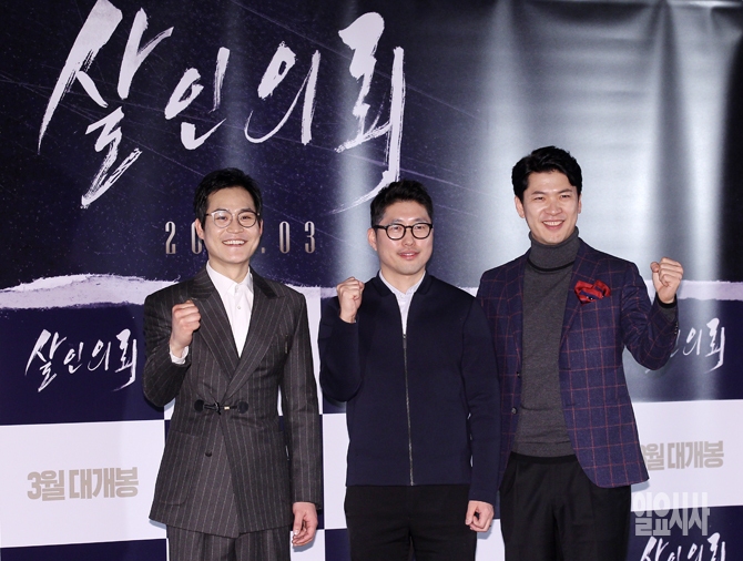 배우 김성균, 손용호 감독, 배우 김상경이 2일 오후 서울 행당동 CGV 왕십리에서 열린 영화 <살인의뢰> 언론시사회 및 기자간담회에서 포즈를 취하고 있다. 한편 이날 참석예정이었던 배우 박성웅은 시사회 중 어지럼증을 호소해 기자간담회에는 불참했다.