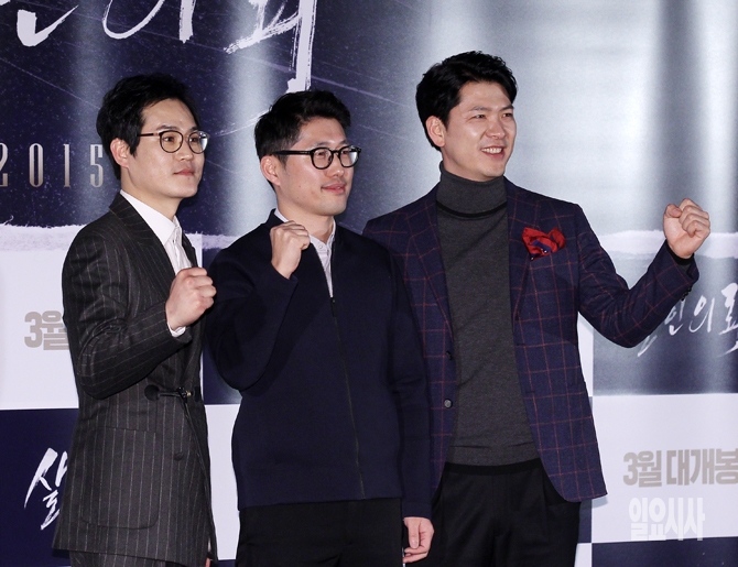 배우 김성균, 손용호 감독, 배우 김상경이 2일 오후 서울 행당동 CGV 왕십리에서 열린 영화 <살인의뢰> 언론시사회 및 기자간담회에서 포즈를 취하고 있다. 한편 이날 참석예정이었던 배우 박성웅은 시사회 중 어지럼증을 호소해 기자간담회에는 불참했다.