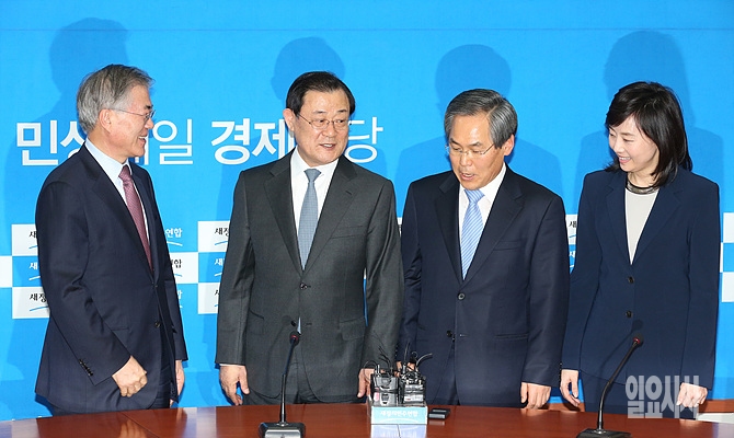 2일, 이병기 신임 대통령실장(사진 왼쪽서 두 번째)과 조윤선 청와대 정무수석(사진 오른쪽)이 서울 여의도 국회 새정치민주연합 당대표실을 찾아 문재인 대표(사진 왼쪽), 우윤근 원내대표를 예방하고 있다.