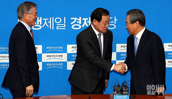 2일, 이병기 신임 대통령실장(사진 가운데)이 서울 여의도 국회 새정치민주연합 당대표실을 찾아 문재인 대표, 우윤근 원내대표와의 예방 자리서 악수를 나누고 있다.