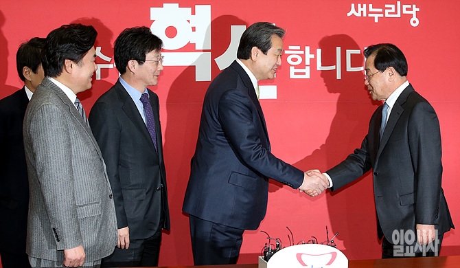 2일, 이병기 신임 대통령실장(사진 오른쪽)이 서울 여의도 국회 새누리당 당대표실을 찾아 김무성 대표(사진 가운데)를 예방한 자리에서 악수를 나누고 있다.