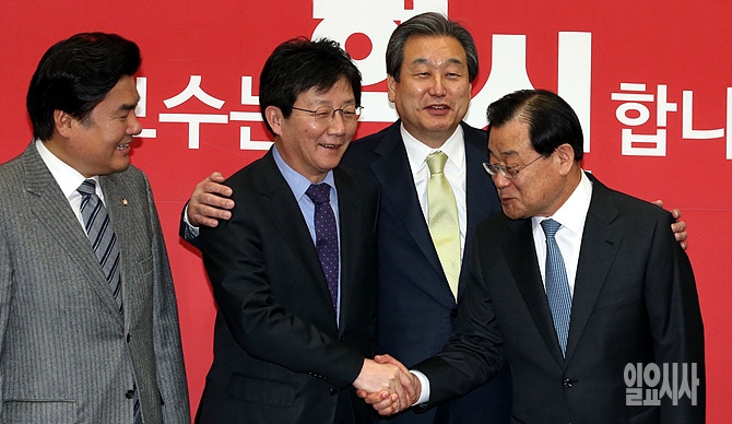 2일, 이병기 신임 대통령실장(사진 오른쪽)이 서울 여의도 국회 새누리당 당대표실을 찾아 유승민 원내대표(사진 가운데)를 예방한 자리에서 악수를 나누고 있다.